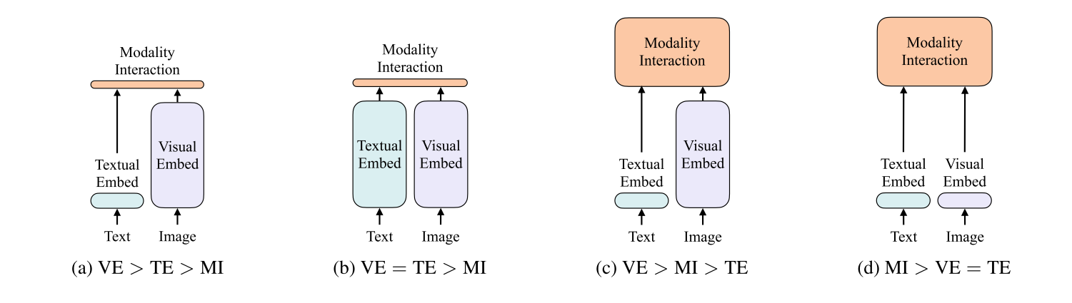 图2. 视觉与语言模型的四个类别。每个矩形的高度表示其相对计算规模。VE、TE和MI分别代表视觉嵌入器、文本嵌入器和模态交互。