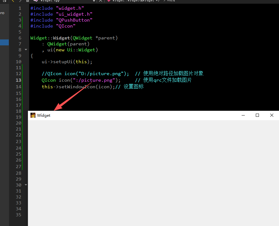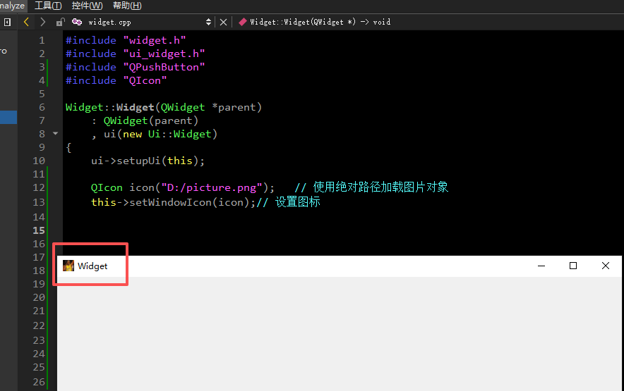 可以看到窗口的图标已经被成功修修改了,但是这样的方式是不推荐的,用户可能在日常操作中不小心将图片删除了。所以我们可以使用QT中的qrc机制来将图片的二进制转换成代码,在生成exe的时候会自动将图标生成。