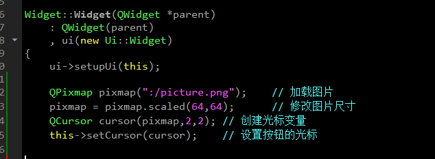 首先创建一个qrc文件管理图片,然后使用QPixmap加载图片,再通过QCursor对象设置光标