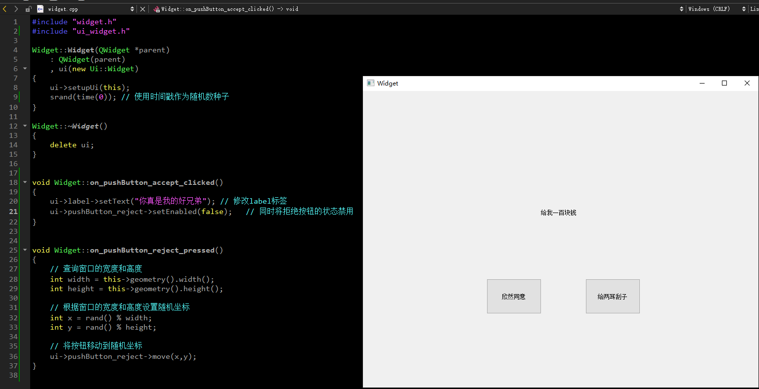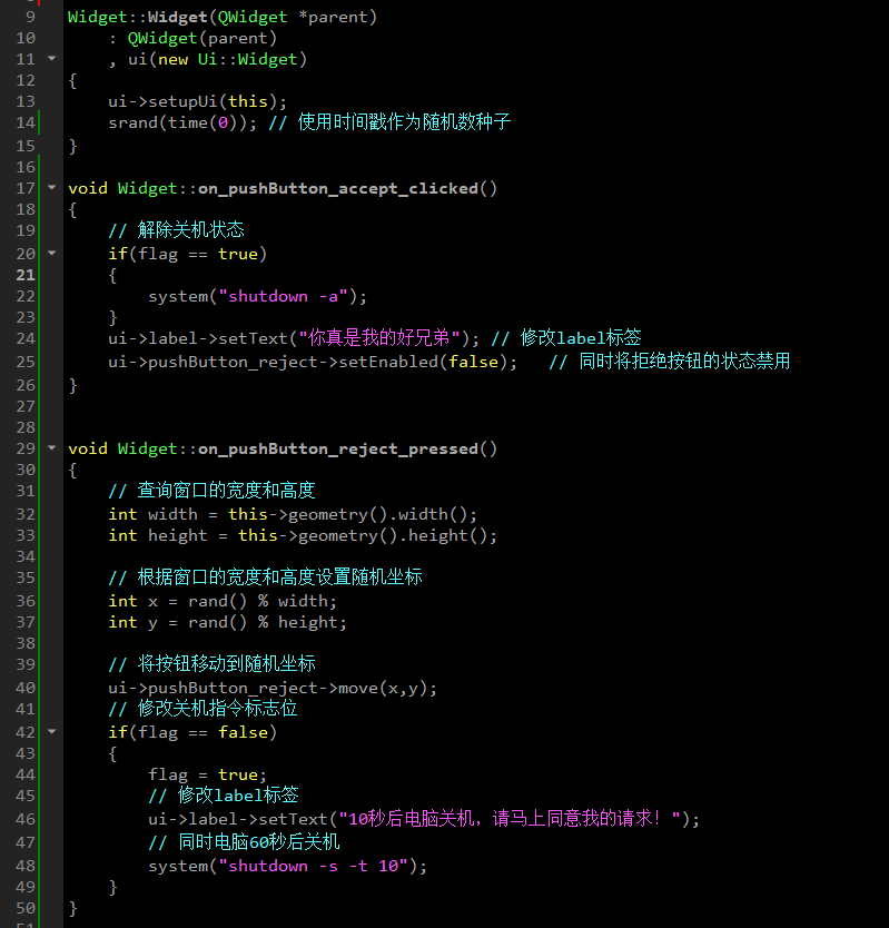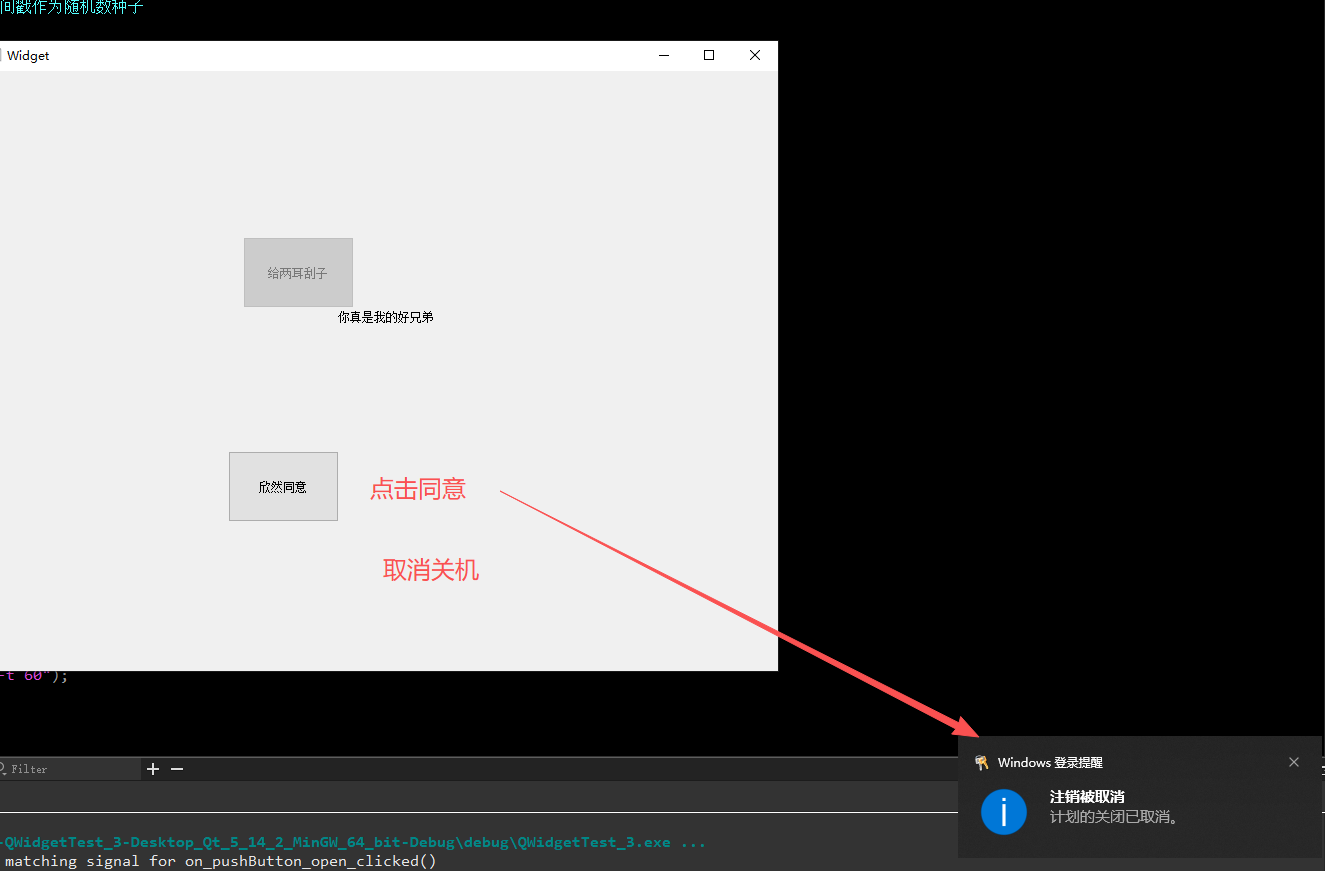 如果做的想要做得"更绝"一点,我们可以在按下拒绝按钮的槽函数中加上关机指令,只有按下同意按钮才可以解除关机状态。当然你也可以拒绝以后直接禁用掉同意的按钮,或者直接写解除关机状态。