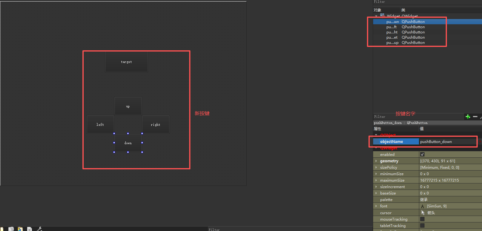 首先创建了五个控件,并且重命名了它们的ObjectName