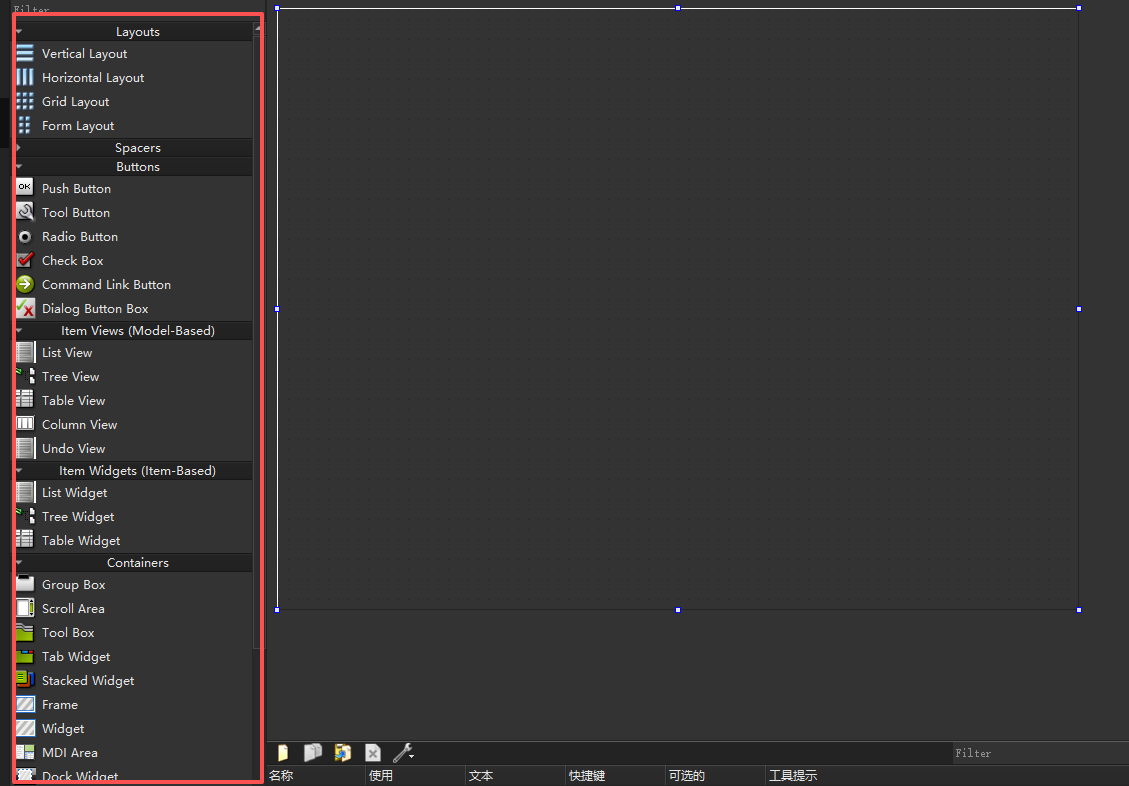 在QtCreater 的设计界面的左边我们可以看到许多的内置控件,拖到窗口中就可以直接使用。
