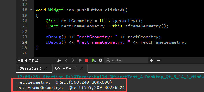 注意,frameGeometry的调用要在构造widget对象以后,在构造⽅法中, Widget 刚刚创建出来, 还没有加⼊到对象树中,此时也就不具备 Window frame。