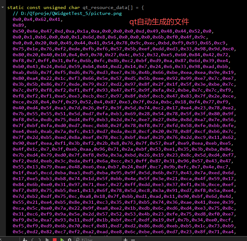 我们可以在项目的工程文件夹中看到生成了一个qrc_resource.cpp文件,其中包括了上面那个图片的二进制数据。当编译代码的时候就会将这个二进制数据加载到exe中。