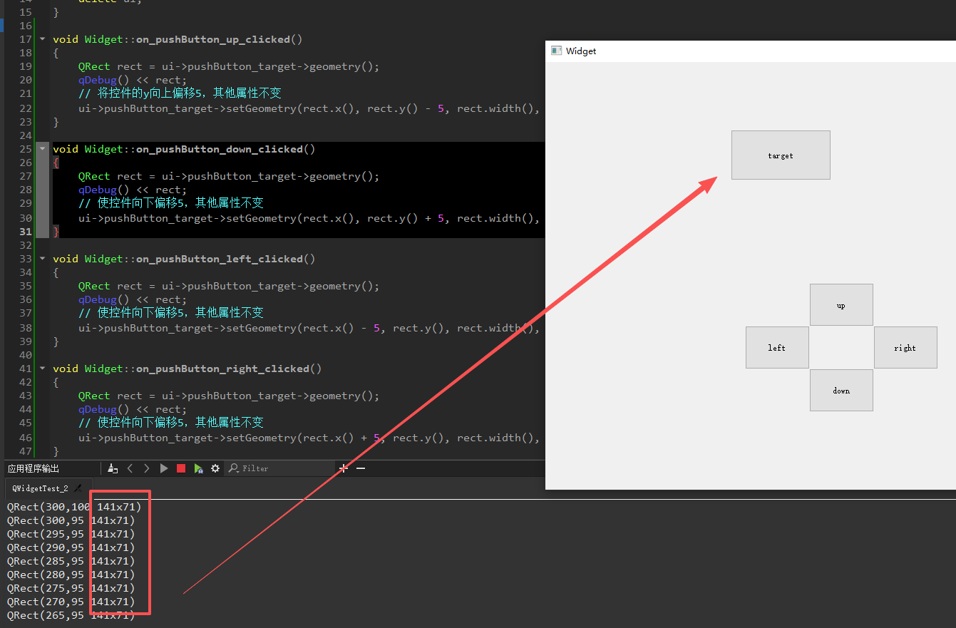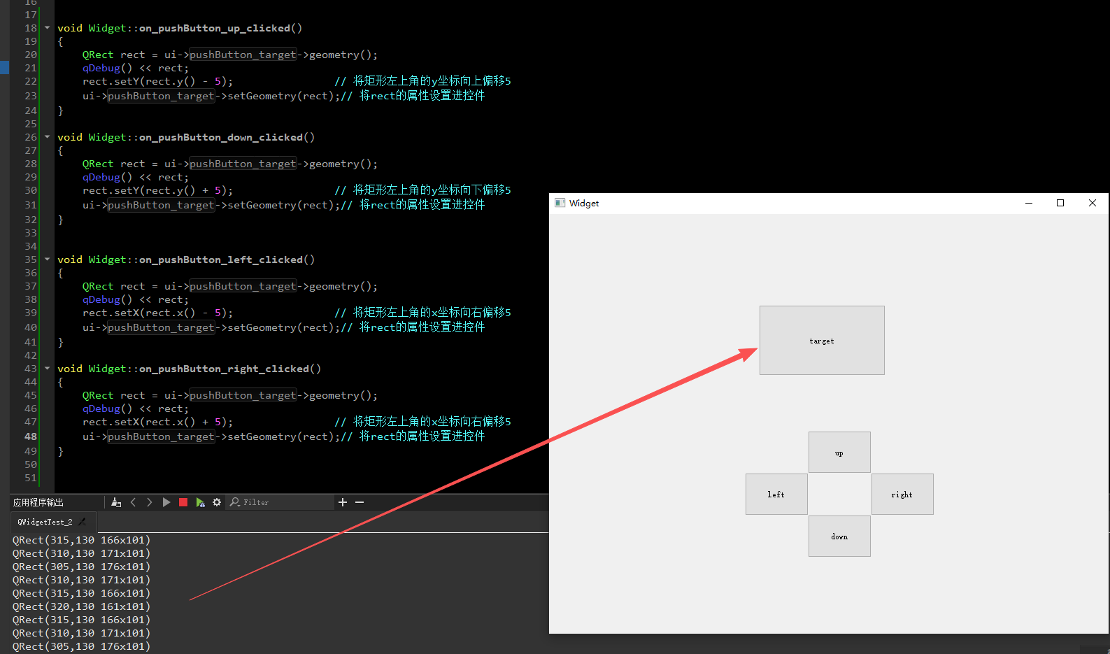 然后将四个控件分别对中间target控件的x和y属性进行修改,这里一旦修改rect的x或者y,整个矩形的宽和高都会随之改变,如果我们要实现平移按钮的感觉,需要使用setGeometry的第二个重载版本。