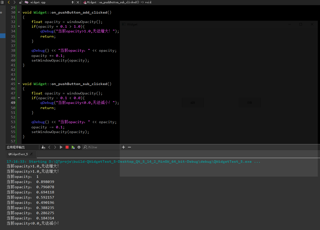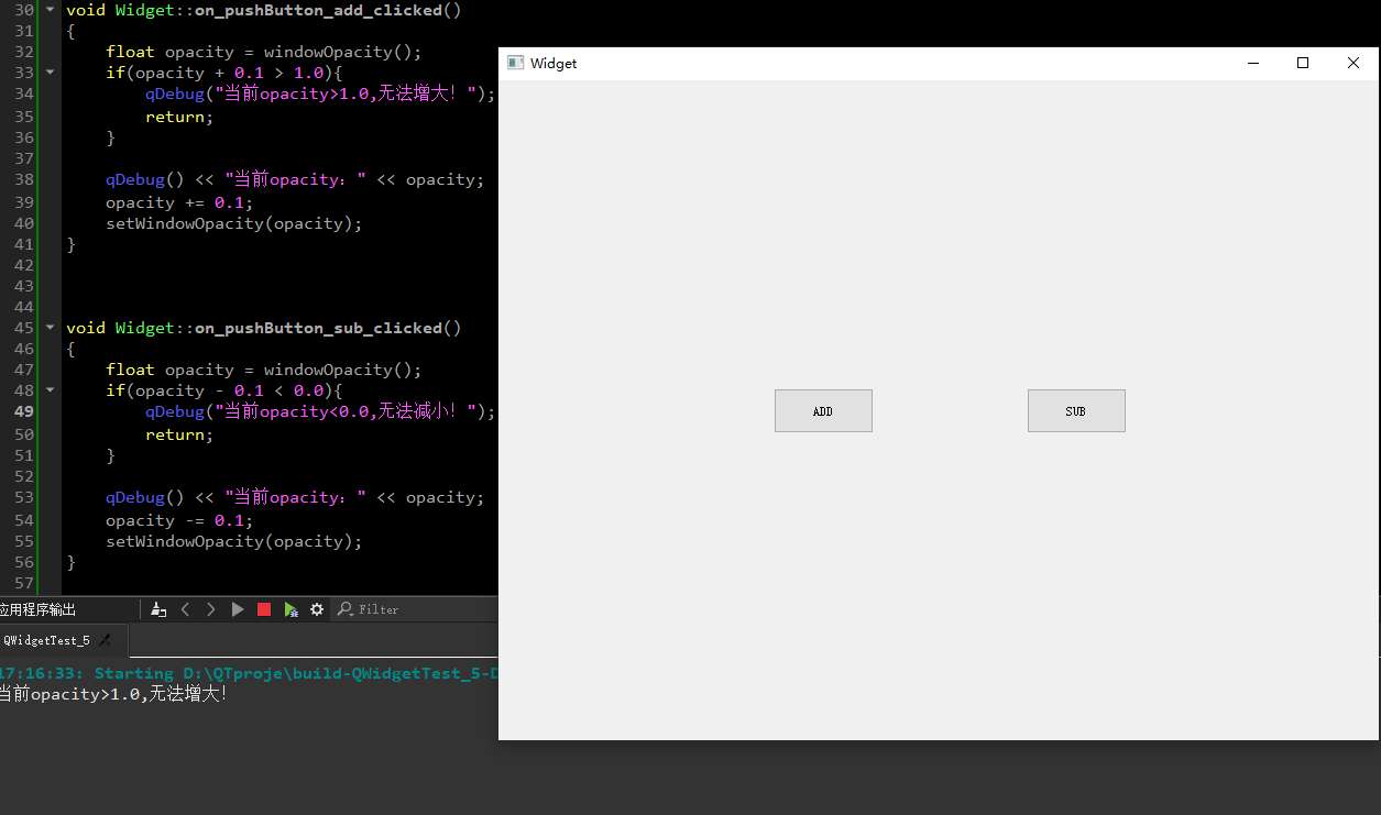 windowOpacity() 获取到控件的不透明度,返回float类型,取值为0.0 - 1.0。0.0表示全透明,1.0表示完全不透明。
