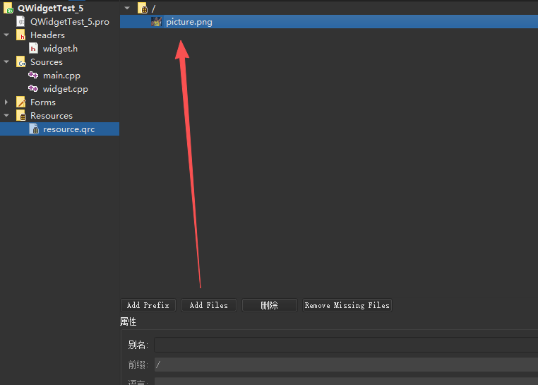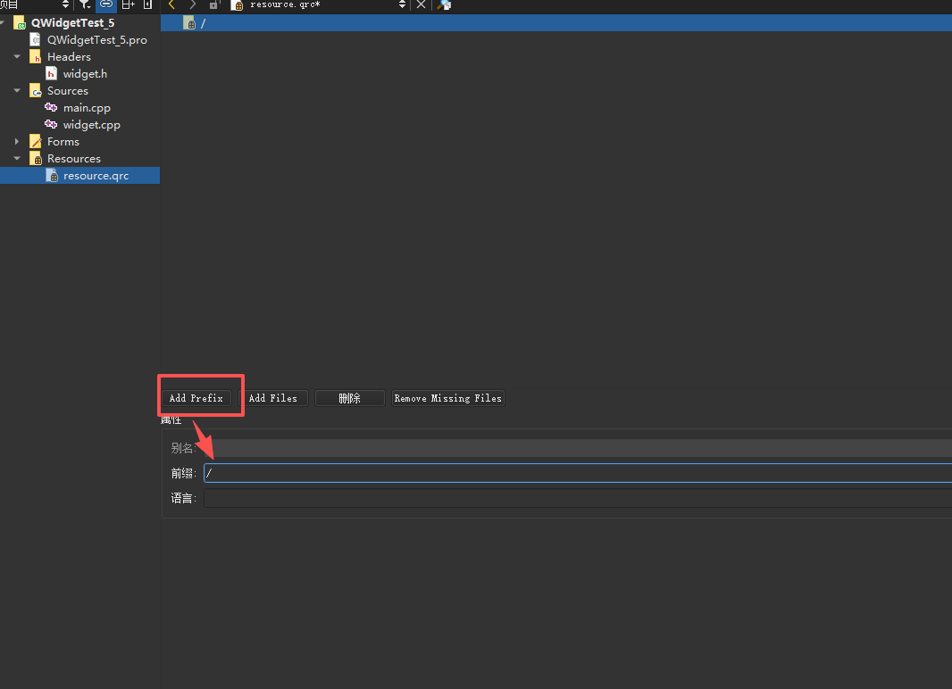 点击Add Prefix,添加一个前缀,这是QT为qrc机制而创建的一个虚拟目录,通过这个虚拟目录来访问加载进来的文件。