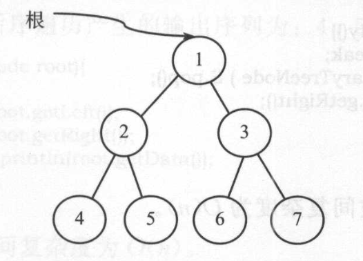 利用前序遍历方法遍历上图所示的树的输出序列为:1 2 4 5 3 6 7。时间负责度为O(n),空间复杂度为O(n)。