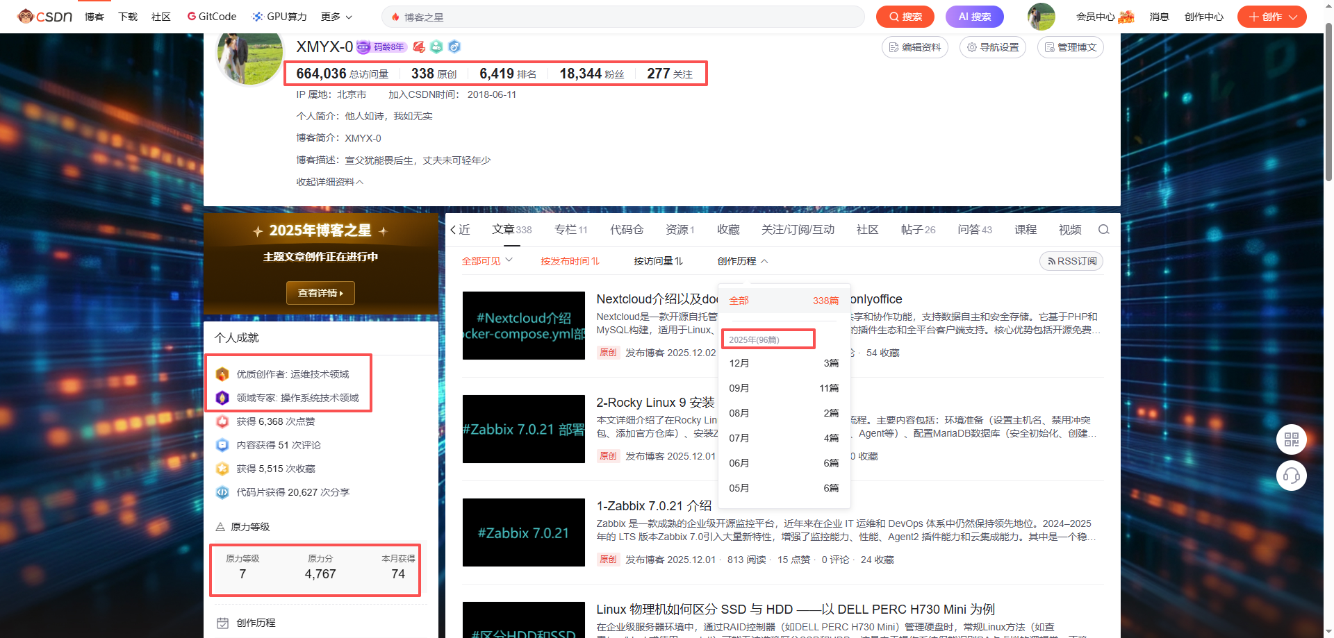 我在 2018 年加入 CSDN,至今码龄 8 年,今年一共输出了 96 篇技术文章,主要聚焦在 Linux、Kubernetes 以及生产环境运维实践上。目前已通过【运维】与【操作系统】领域认证。