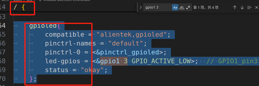 led-gpios = <&gpio1 3 GPIO_ACTIVE_LOW>; // GPIO1_pin3 低电平有效
