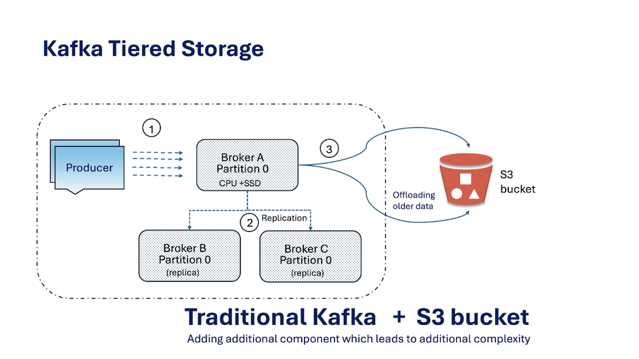 传统上,Kafka Broker 将所有数据存储在本地磁盘中。这种方式速度快,但成本高且扩展性差 ------ 一旦磁盘空间耗尽,你要么增加更多 Broker,要么更换更大容量的磁盘,这导致存储扩展与计算扩展深度绑定。