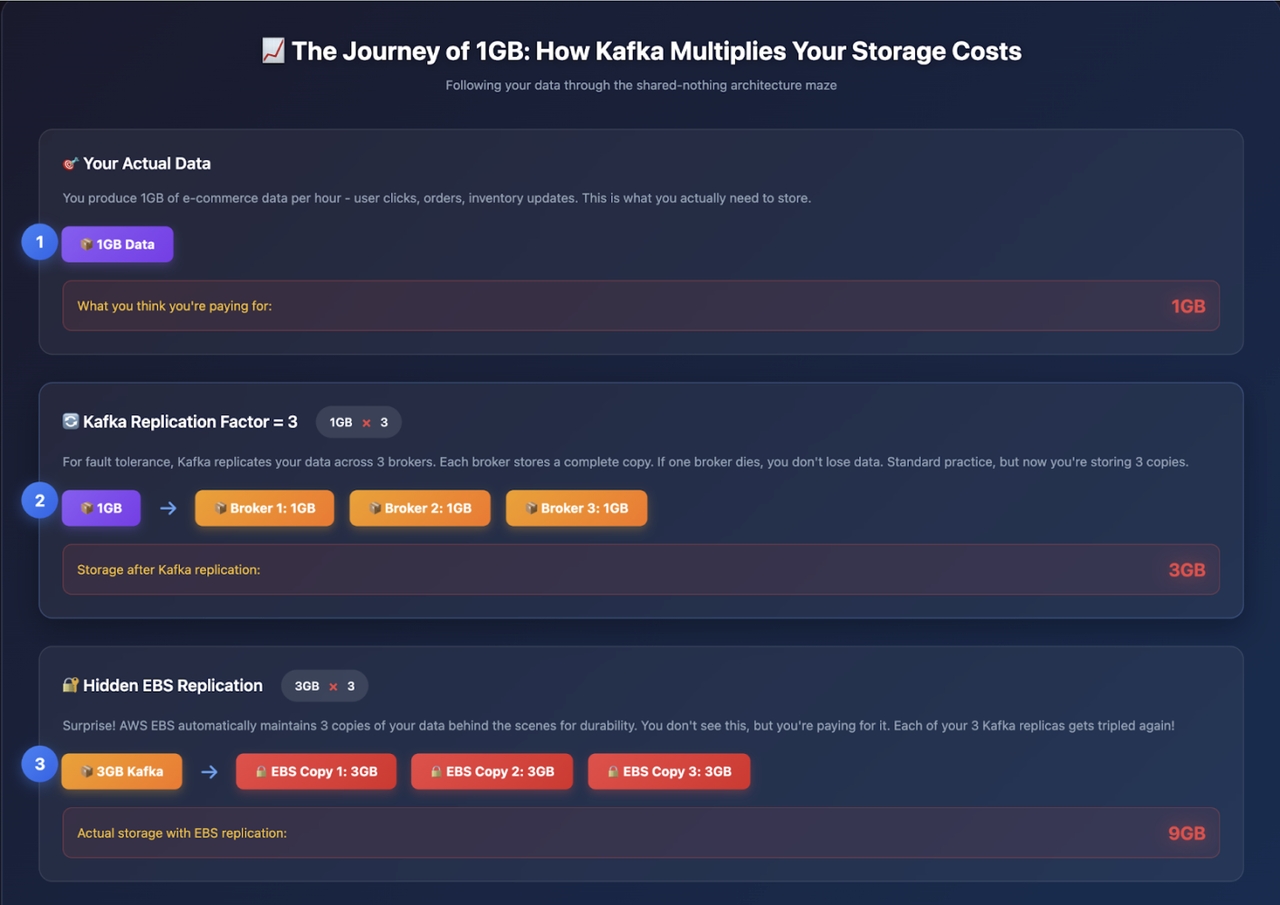 - 9 倍的数据冗余(没错,你没看错 ------Kafka 3 倍副本 × EBS 3 倍副本)。