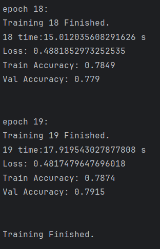 import torch from torchvision import datasets from torchvision import transforms import torch.nn as nn import torch.optim as optim import time if __name__ == '__main__': # 数据预处理 transform = transforms.Compose([ transforms.ToTensor(), transforms.Normalize((0.5, 0.5, 0.5), (0.5, 0.5, 0.5)) ]) device = torch.device("cuda" if torch.cuda.is_available() else "cpu") # 加载数据集 data_path = '../data-unversioned/p1ch7' cifar10 = datasets.CIFAR10(data_path, train = True, download = False, transform = transform) cifar10_val = datasets.CIFAR10(data_path, train = False, download = False, transform = transform) print(f'数据集加载成功') # 定义标签和数据 label_map = {0:0, 2:1} class_name = {'airplane', 'bird'} # for img, label in cifar10 # if label in [0, 2] # (img, label_map[label]) cifar2 = [(img, label_map[label]) for img, label in cifar10 if label in [0, 2]] cifar2_val = [(img, label_map[label]) for img, label in cifar10_val if label in [0, 2]] train_loader = torch.utils.data.DataLoader(cifar2, batch_size = 256, shuffle = True, num_workers = 2, pin_memory = True) val_loader = torch.utils.data.DataLoader(cifar2_val, batch_size = 256, shuffle = True, num_workers = 2, pin_memory = True) print(f'数据集预处理完毕') # 创建模型 n_out = 2 model = nn.Sequential(nn.Flatten(),nn.Linear(3072, 1024), nn.Tanh(), nn.Linear(1024, 512), nn.Tanh(), nn.Linear(512, 128), nn.Tanh(), nn.Linear(128, n_out)).to(device) print(f'模型创建完毕') # 损失函数 loss_fn = nn.CrossEntropyLoss() print(f'损失函数创建完毕') # 优化器 learning_rate = 1e-2 optimtize = optim.Adam(model.parameters(), lr = learning_rate) print(f'优化器创建完毕') print(f'开始训练') for epoch in range(20): print(f'epoch {epoch}:') start_time = time.time() # ----训练阶段---- model.train() running_loss = 0.0 train_correct = 0 train_total = 0 for img, label in train_loader: img = img.to(device) label = label.to(device) out = model(img) loss = loss_fn(out, label) optimtize.zero_grad() loss.backward() optimtize.step() running_loss += loss.item() _, predicted = torch.max(out, dim=1) train_total += label.shape[0] train_correct += int((predicted == label).sum()) # ----验证阶段---- model.eval() val_correct = 0 val_total = 0 with torch.no_grad(): for img, label in val_loader: img = img.to(device) label = label.to(device) out_put = model(img) _, predicted = torch.max(out_put, dim = 1) val_total += label.shape[0] val_correct += int((predicted == label).sum()) end_time = time.time() avg_loss = running_loss / len(train_loader) print(f'Training {epoch} Finished.') print(f'{epoch} time:{end_time - start_time} s') print(f'Loss: {avg_loss}') print(f'Train Accuracy: {train_correct / train_total}') print(f'Val Accuracy: {val_correct / val_total}') print('\n') print('Training Finished.')得出结果来