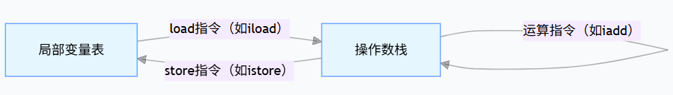 xload_n指令(如iload_1、aload_2),将局部变量表中指定位置的数据压入操作数栈,为计算做准备; - 数据流向 2(操作数栈 → 局部变量表) :通过