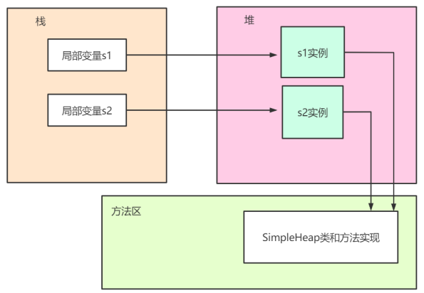 声明的局部变量存放在栈中,而方法中的对象实例创建放在堆中,剩下的类与方法的实现在方法区。