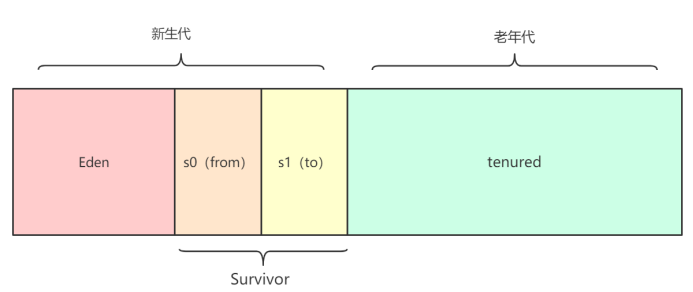 根据垃圾回收机制的不同,Java堆有可能拥有不同的结构。最为常见的一种构成是将整个Java堆分为新生代和老年代。新生代包含Eden+Survivor区,survivor区里面分为from和to区,内存回收时,如果用的是复制算法,从from复制到to(我们也教s0,s1),当经过一次或者多次GC之后,存活下来的对象会被移动到老年区其中,新生代有可能分为eden区、s0区、s1区,s0 和s1也被称为from和to区域,它们是两块大小相等、可以互换角色的内存空间。