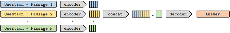 本工作所提的方法与先前作品的不同之处在于生成模型 如何处理检索到的段落,即编码阶段独立,解码阶段融合。这允许扩展到大量文档,并从大量证据中受益。