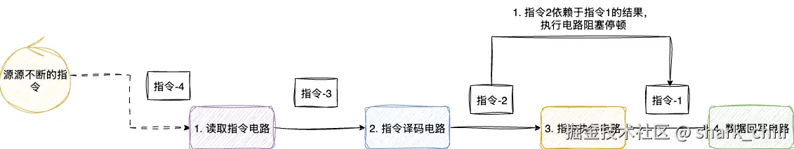 - 读取指令电路传递指令2,读取指令3,译码电路完成指令1解析,继续指令读取指令电路传递来的指令2