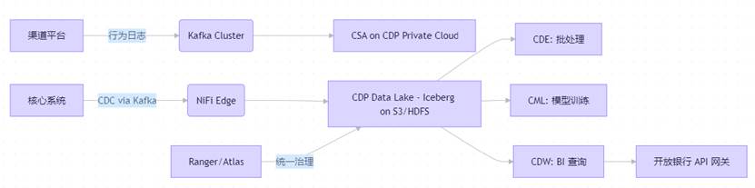 | 5. 开放银行平台 | 对外 API 输出聚合数据(如征信、资产证明) | 通过 CMP 提供受控数据服务(如 NiFi API 或 REST on Spark);严格权限与审计 |