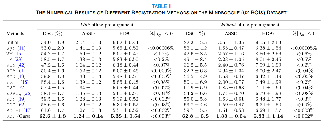 - 结果 :大多数方法(如 VoxelMorph, TransMorph)在处理未预对齐数据时,性能大幅下降(Dice 暴跌)。而 RDP 即使在没有预对齐的情况下,依然保持了极高的精度 ,甚至超过了其他方法在预对齐数据上的表现。