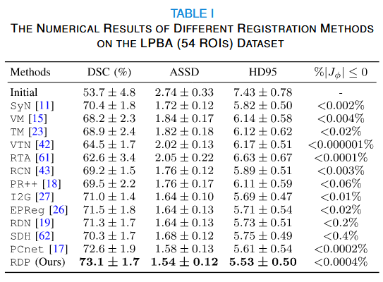 在所有三个数据集上,RDP 在 Dice Score (DSC) 、ASSD 和 Hausdorff Distance 指标上均取得最优结果。特别是在 Mindboggle 这种大变形数据集上,RDP 表现尤为出色。