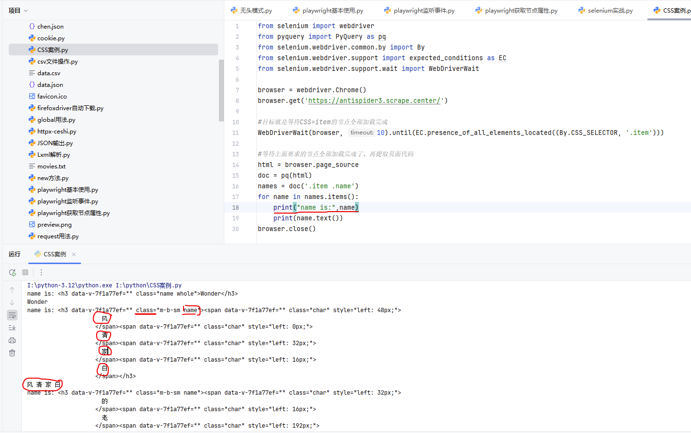 names.items():调用PyQuery集合对象的items()方法,返回一个可迭代的生成器,每次迭代会返回集合中的一个单个元素(封装为PyQuery实例)。for name in names.items():通过 for 循环遍历该生成器,将每次迭代得到的单个元素赋值给变量name。print(name.text()):调用单个元素name的text()方法,提取该元素的纯文本内容 ,并通过print()打印输出。