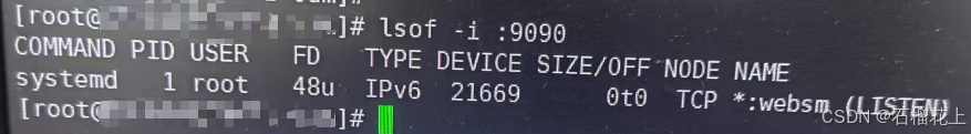 用netstat -tupln|grep 9090、 lsof -i :9090 发现该端口已被占用。并且发现占用该端口的进程是root用户的1号进程systemd,使用该端口的服务是websm。