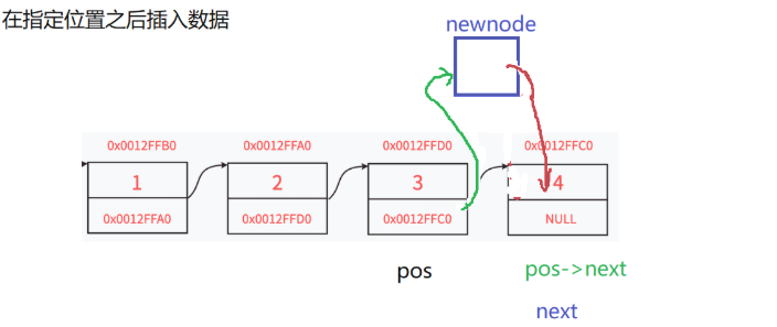 这个比刚才的更简单,因为在后,所以直接省一个参数,我们把新节点next指向pos->next即可,pos->next = newnode就可以啦,如图: