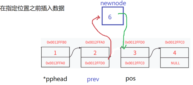 其实这里就是把前面综合一点而已,既然我们想要再pos节点之前插入数据,那么就先找到pos的前一个节点,然后把新节点的next指向pos,pos的前一个节点的next指向新节点即可,这样不就插入进去了嘛。