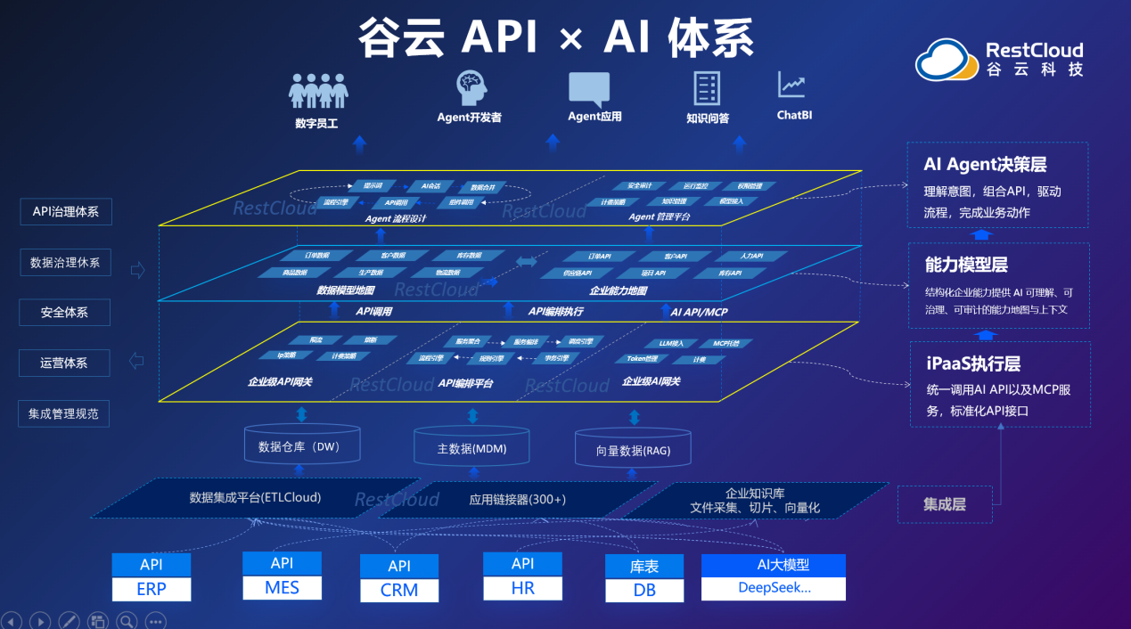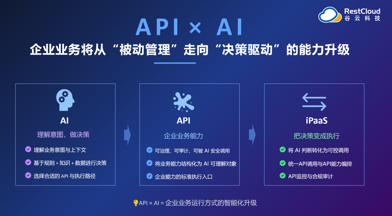 三者共同构成AI驱动业务的完整闭环,同时,谷云明确指出:API × AI并不取代现有业务系统,而是通过API驱动跨系统的智能业务执行,让企业系统从"被集成",走向"被理解、被决策、被指挥"。