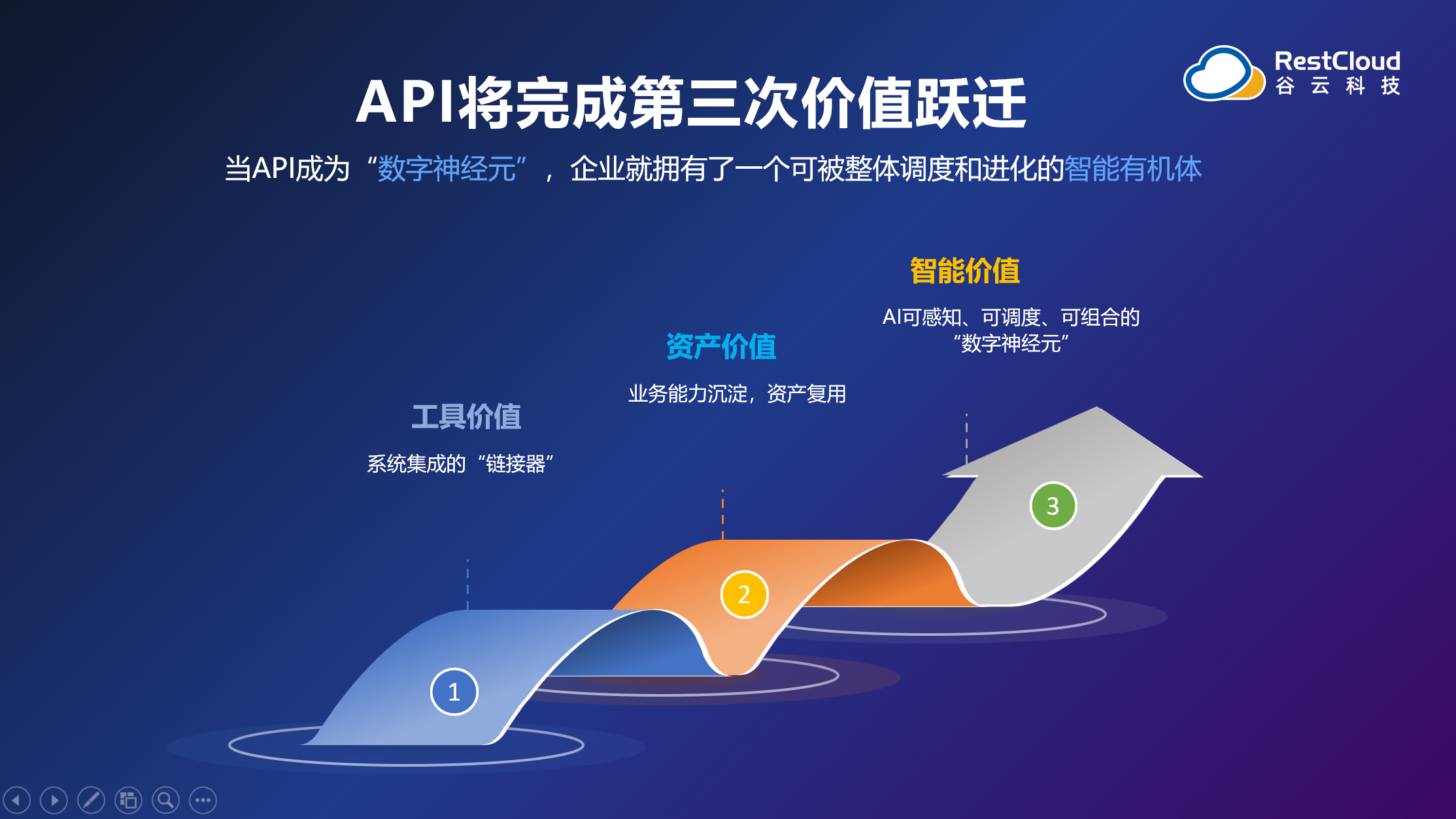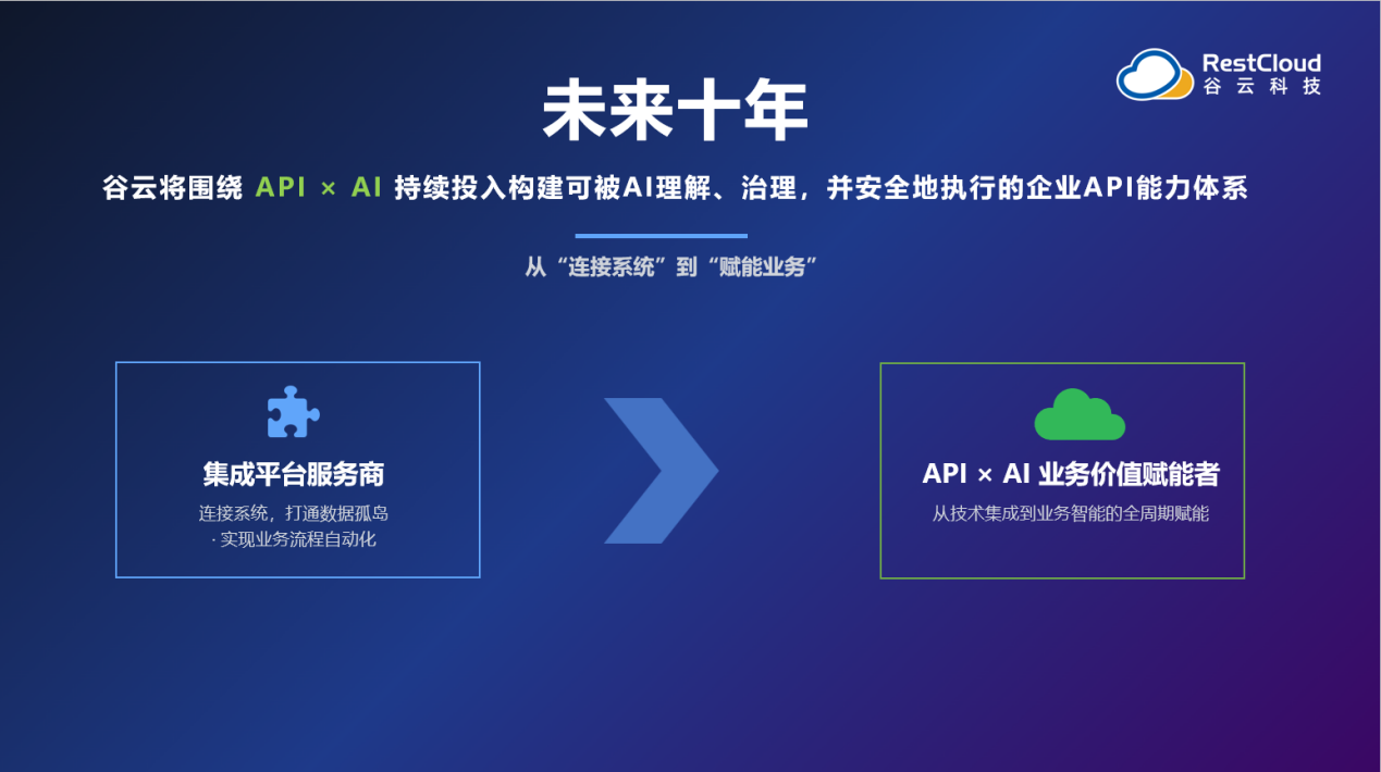 在发布会的最后,谷云科技正式宣布未来十年的定位升级:从"连接系统、打通数据孤岛的集成平台服务商",走向"API × AI业务价值赋能者"。