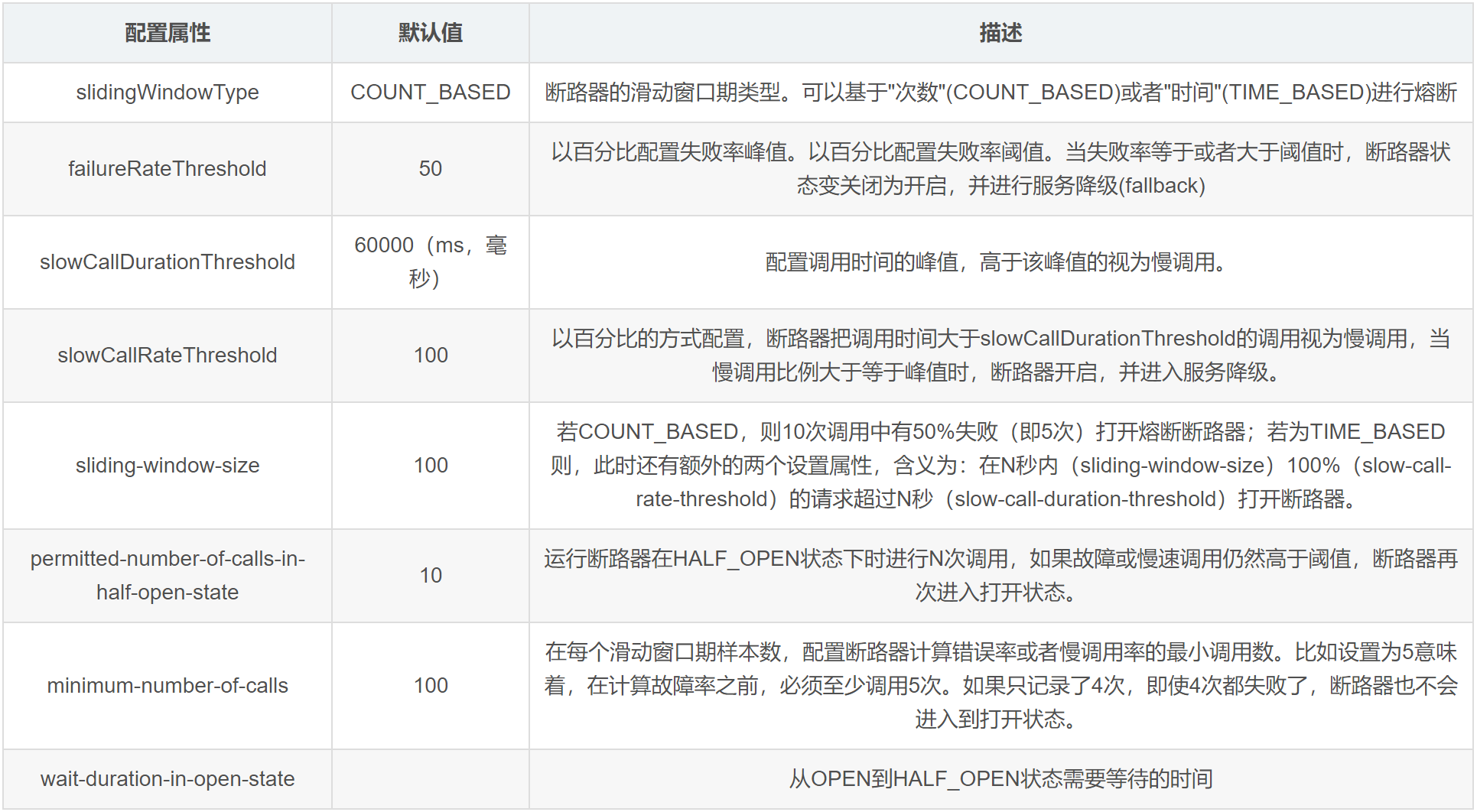 slowCallDurationThreshold: 2s #慢调用时间阈值,高于这个阈值的视为慢调用并增加慢调用比例。