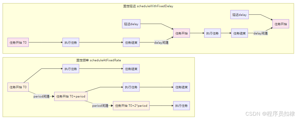 与AtFixedRate的关键区别 : scheduleWithFixedDelay保证了任务执行间的最小间隔,即使任务执行时间超过了设定的延迟,也不会导致任务快速累积。