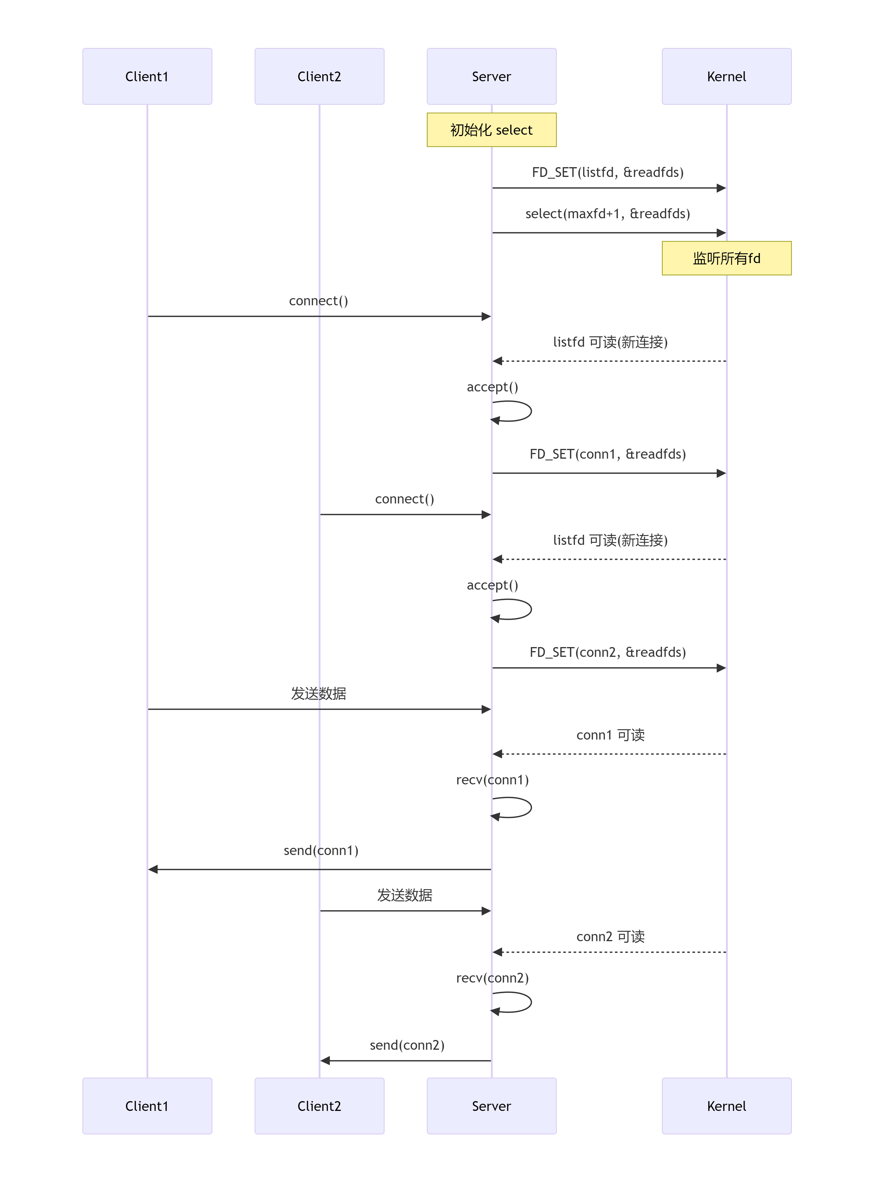 | 缺点 | 1. 每次调用需要复制fd_set 2. 需要遍历所有fd 3. 默认最大支持1024个连接 4. 内核每次都要遍历所有fd |
