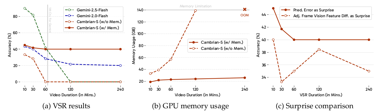 结果。我们将带有和不带有惊奇基础记忆系统的 Cambrian-S 与两个先进的专有模型 Gemini-1.5-Flash [122] 和 Gemini-2.5-Flash [30] 在 VSR 基准上进行了比较。如图 11a 所示,Cambrian-S (w/ Mem.) 在所有视频长度上都优于 Gemini-1.5-Flash 和 Cambrian-S (w/o Mem.),展示了跨视频持续时间的稳定空间感知性能。虽然 Gemini-2.5-Flash 在一小时内的视频上产生了很好的结果,但它无法处理更长的输入。除了保持高精度外,Cambrian-S (w/ Mem.) 还在不同视频长度上保持稳定的 GPU 内存使用率(图 11b)。这表明惊奇基础记忆有效地压缩了冗余数据而没有丢失关键信息。我们在表 17 中包括了两个长视频基线,MovieChat [119] 和 Flash-VStream [159],以供比较。