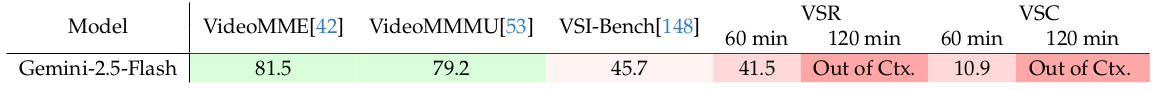 最先进的模型在 VSI-SUPER 上陷入困境。为了测试 VSI-SUPER 是否对前沿 MLLM 构成真正的挑战,我们评估了最新的 Gemini-2.5-Flash [122]。如表 1 所示,尽管拥有 1,048,576 个 token 的上下文长度,该模型在处理两小时视频时仍达到其上下文限制。这突出了视频理解的开放式性质,其中连续流实际上需要"无限输入,无限输出"的上下文,并且可以任意增长,这表明仅仅扩展 token、上下文长度或模型大小可能是不够的。虽然是合成的,但我们的基准反映了空间超感知中的一个真实挑战:人类毫不费力地整合并保留从数小时或数年展开的持续感官体验中获得的信息,而目前的模型缺乏类似的可持续感知和记忆机制。Gemini-2.5-Flash 在关注语义感知和语言理解的视频基准(如 VideoMME [42] 和 VideoMMMU [53])上表现出强大的性能,达到了约 80% 的准确率。然而,即使对于完全在其上下文窗口内的 VSI-SUPER 中的 60 分钟视频,VSR 和 VSC 上的性能仍然有限------分别为 41.5 和 10.9。如图 6 所示,该模型的预测对象计数未能随视频长度或真实物体数量扩展,而是在一个小的恒定值处饱和,表明计数能力缺乏泛化性且依赖于训练分布先验。