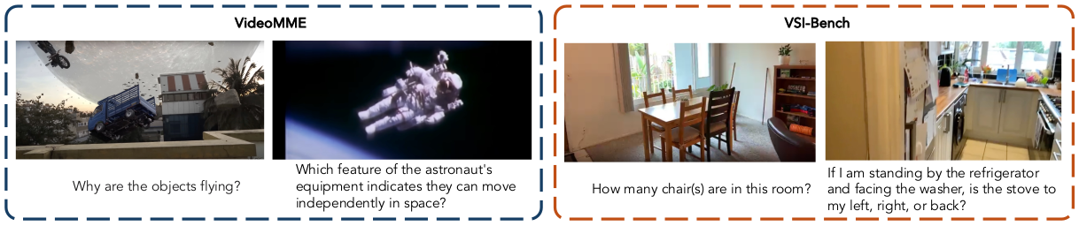 图 3 | 当前视频基准中空间感知概念化的插图 :左侧展示了 VideoMME [42] 中"空间推理"子类别的示例,包括关于重力和宇航员装备的问题。相比之下,右侧展示了 VSI-Bench [148] 的样本,突出了视觉-空间推理任务,如物体计数、识别相对方向、路线规划等。