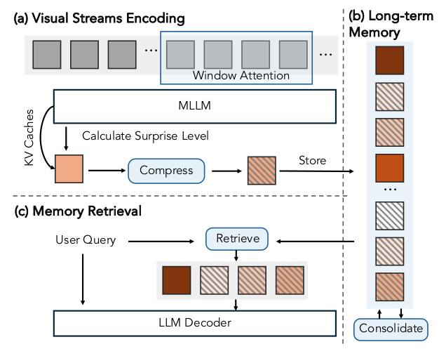 惊奇驱动的记忆管理系统 。我们的记忆管理系统基于"惊奇"的估计动态压缩和整合视觉流。如图 10-a 所示,我们使用具有固定窗口大小的滑动窗口注意力对传入帧进行编码。潜帧预测模块随后测量"惊奇水平"并将其分配给每一帧的 KV 缓存。惊奇水平低于预定义阈值的帧在被推入长期记忆之前经过 2 倍压缩。为了保持稳定的 GPU 内存占用,此长期记忆通过整合函数限制为固定大小,该函数再次基于惊奇操作:根据惊奇分数丢弃或合并帧(见图 10-b)。最后,在收到用户查询时,系统通过计算查询与存储帧特征之间的余弦相似度,从长期记忆中检索前 KKK 个最相关的帧(见图 10-c)。更多设计细节见第 F.2 节。虽然之前的工作探索了长视频的记忆系统设计 [119, 159],但我们的重点是探索预测误差(即惊奇)作为指导信号。