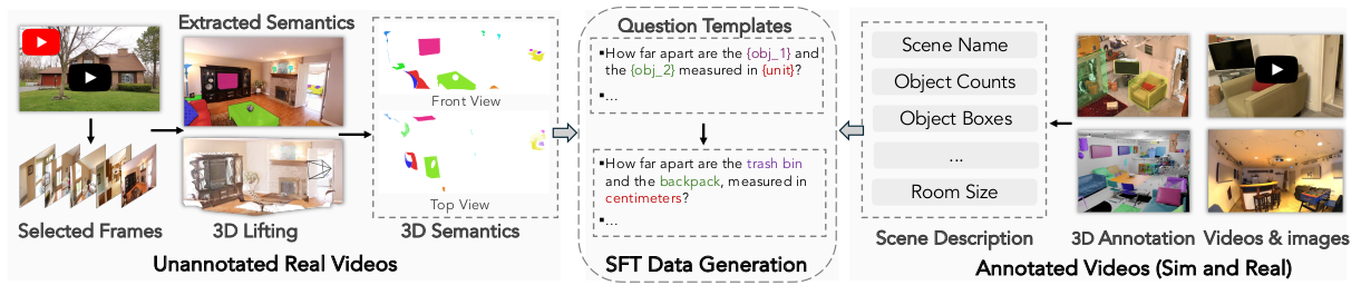 - 生成 QA:利用 12 种时空问题模板(如"门离桌子多远?")生成问答对。