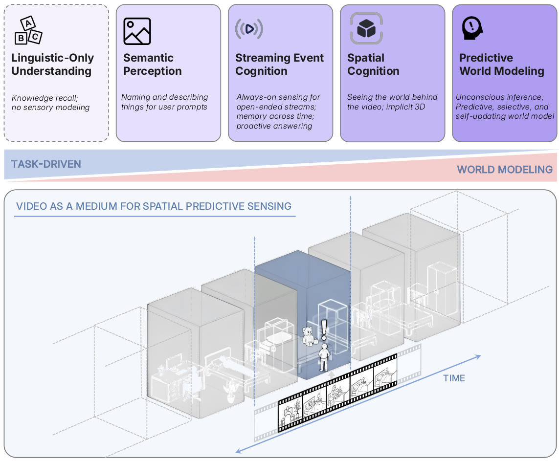 | 核心概念 | 空间超感知 (Spatial Supersensing):超越语言描述,包含流式事件认知、隐式 3D 空间认知和预测性世界建模的能力。 |
