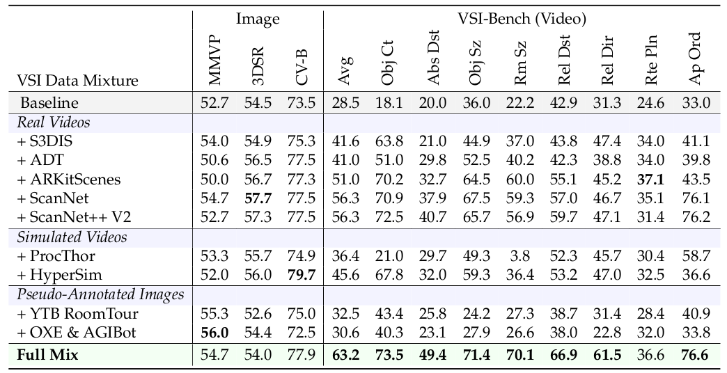 VSI-590K 数据源消融 。为了评估我们提出的 VSI-590K 数据集的有效性,我们通过微调第 3.1 节中描述的改进版 Cambrian-1 MLLM 进行了消融研究,使用了 LLaVA-Video-178K [161] 中的一部分视频指令微调样本。该模型作为表 3 中的基线。通过在单个数据集以及它们的组合上微调模型来评估每个数据源的贡献。VSI-590K Full Mix(全混合)在视频空间推理任务上实现了最高的整体性能,优于基线和所有单一来源的对应物。所有数据源在微调后都做出了积极贡献,尽管它们的有效性各不相同。