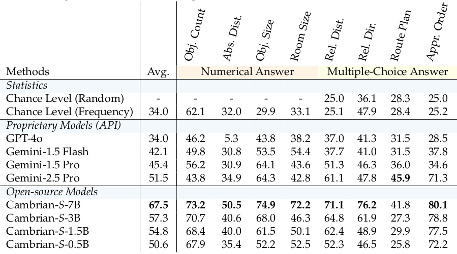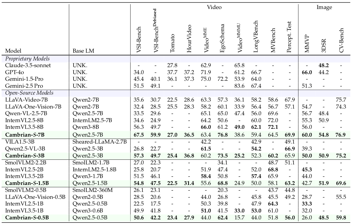 | 模型贡献 | Cambrian-S:基于 Qwen2.5 和 SigLIP2 的空间接地视频 MLLM,在 VSI-Bench 上 SOTA。 |