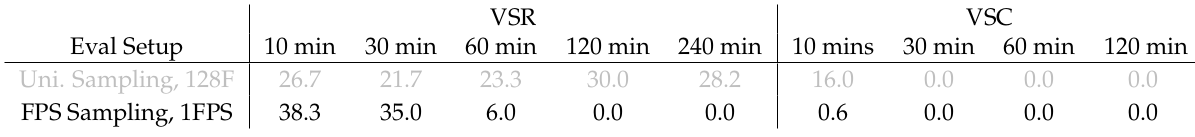 除了标准评估(即在视频结束时提问)外,我们还在多个时间戳查询模型,以评估其在流式设置中的性能,其中 VSC 中的正确答案随时间动态演变。为了检查长期一致性,VSC 包括四种视频时长:10、30、60 和 120 分钟。对于此定量任务,我们使用平均相对准确度 (MRA) 指标报告结果,与 VSI-Bench 评估协议 [148] 一致。