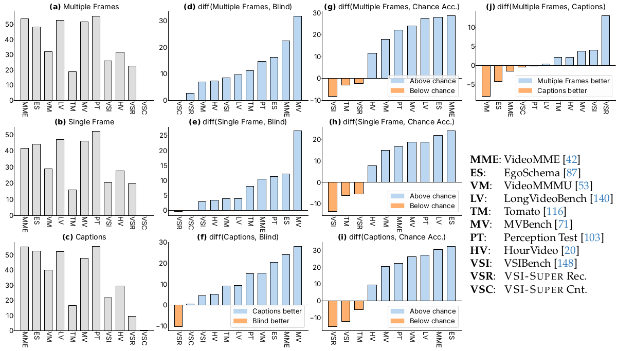 MLLM 的最新进展导致了 Video-QA 基准的激增。然而,一个关键问题仍然存在:现有的视频基准在多大程度上真正检查了视觉感知能力,而不是简单地测试语言先验? 我们的诊断测试通过改变视觉输入的丰富度和文本线索的信息量,解开了模型对视觉感知与语言先验的依赖。仅通过纯文本输入(例如字幕或盲 MLLM)即可解决的基准偏向于检查语言理解。相反,只有通过多帧输入才能回答的基准问题需要真正的视觉感知。我们使用基于图像的多模态大语言模型 Cambrian-1 [124] 进行评估,这使我们能够探测潜在的任务需求,而不会将其与视频特定架构和后训练配方的能力混淆。