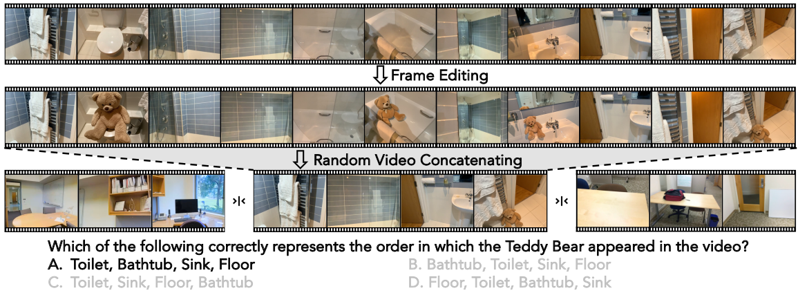 VSI-SUPER Recall (VSR):长时程空间观察与回忆。VSR 基准要求 MLLM 观察长时程时空视频,并按顺序回忆不寻常物体的位置。如图 4 所示,为了构建此基准,人工标注者使用图像编辑模型(即 Gemini [30])将令人惊讶或格格不入的物体(例如泰迪熊)插入视频的四个不同帧(和空间位置)中,该视频捕捉了室内环境的漫游 [33, 153, 12]。然后将此编辑过的视频与其他类似的房间游览视频连接起来,创建一个任意长且连续的视觉流。此任务类似于语言领域中常用的"大海捞针"(NIAH)测试,用于压力测试 LLM 的长上下文能力 [79]。类似的 NIAH 设置也被提议用于长视频评估 [162, 138, 54]。然而,与插入不相关的文本段或帧的基准不同,VSR 通过帧内编辑保留了"针"的真实性。它通过要求顺序回忆进一步扩展了挑战,这实际上是一个多跳推理任务,并且在视频长度上保持任意可扩展。为了彻底评估模型在不同时间尺度上的性能,该基准提供了五种时长:10、30、60、120 和 240 分钟。
