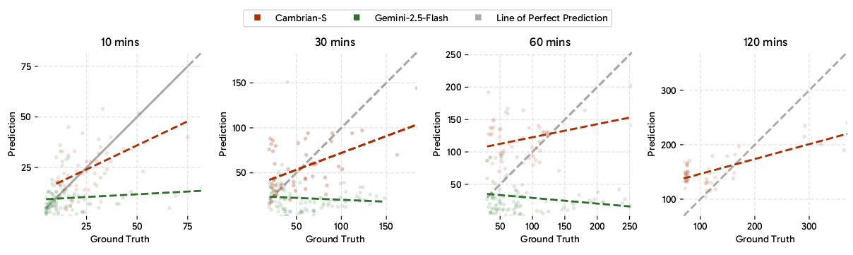 结果。Gemini-1.5-Flash 在 VSC 上获得接近零的性能(图 13a),显示了任务的难度。尽管 Gemini-2.5-Flash 在 10 分钟视频上产生了好得多的结果,但在更长的视频上其性能迅速下降。相比之下,Cambrian-S (w/ Surprise Seg.) 使用的惊奇驱动事件分割方法在所有视频长度上实现了更高且更稳定的性能。当视频使用地面真值场景转换进行分割(即 Cambrian-S w/ GT Seg.)时,性能进一步提高,代表了一个近似上限。图 14 的深入分析显示,Gemini-2.5-Flash 的预测局限于有限范围,并且随着视频中出现更多物体而不按比例增加。相比之下,Cambrian-S (w/ Surprise Seg.) 产生的计数虽然尚未完全准确,但与真实物体数量表现出更强的相关性,表明更好的泛化能力。