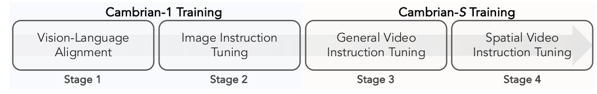 基于所有先前的见解,我们开发了 Cambrian-S ,这是一个空间接地的模型家族,具有不同的 LLM 规模:0.5B、1.5B、3B 和 7B 参数。这些模型通过专门设计的四阶段训练流程构建,首先建立通用的语义感知,然后开发专门的空间感知技能,如图 8 所示。
