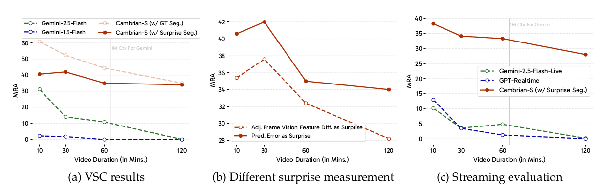 流式设置中的评估。由于 VSC 中的正确答案随视频演变,我们创建了一个流式 QA 设置,在 10 个不同的时间戳提出相同的问题。最终性能是所有查询的平均值。我们以针对实时视觉输入进行营销的商业 MLLM 为基准。如图 13c 所示,尽管 Gemini-Live 和 GPT-Realtime 旨在用于流式场景,但它们在 10 分钟视频上的 MRA 低于 15%,并且在 120 分钟的流上性能下降到接近零。然而,Cambrian-S 表现出更强的性能,在 10 分钟流上达到 38% MRA,并在 120 分钟时保持在 28% 左右。