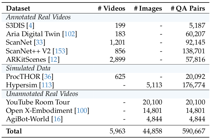 - 模拟数据 (Simulated data):由于 3D 标注数据的可用性有限,仅从真实标注视频构建大规模且多样化的 3D 标注 SFT 数据集具有挑战性。遵循 SIMS-V [13],我们利用具身模拟器程序化地生成空间接地的视频轨迹和 QA 对,在 ProcTHOR [36] 场景中渲染了 625 个视频遍历,具有不同的布局、物体配置和视觉外观。我们对 Hypersim [113] 应用了相同的方法,从 461 个室内场景中采样了 5,113 张图像。利用实例级边界框,我们生成了与我们标注的真实视频设置一致的问答对。
