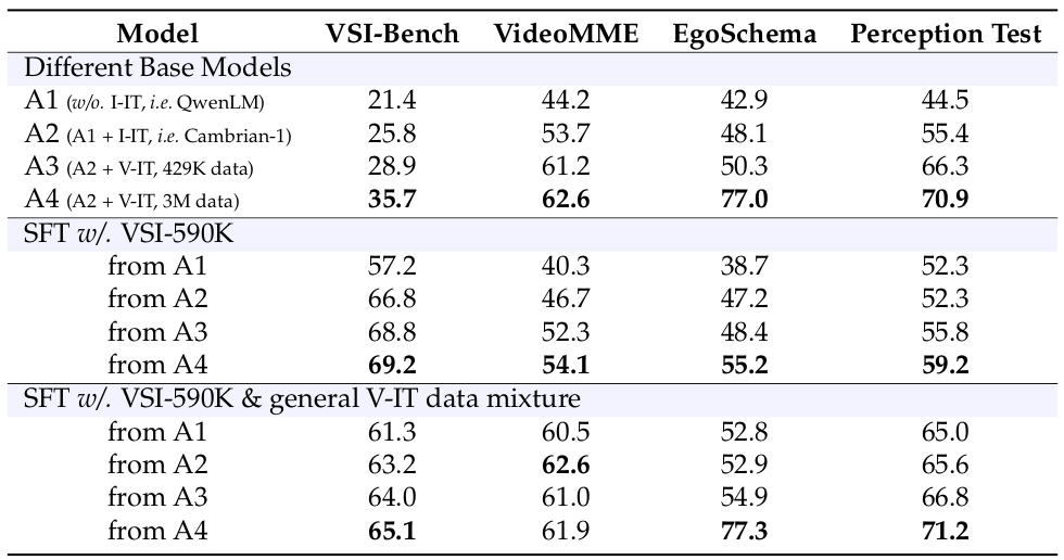 然后,我们使用两种不同的数据配方微调这些模型:(1) 仅 VSI-590K,和 (2) VSI-590K 混合类似数量的通用视频指令微调数据。